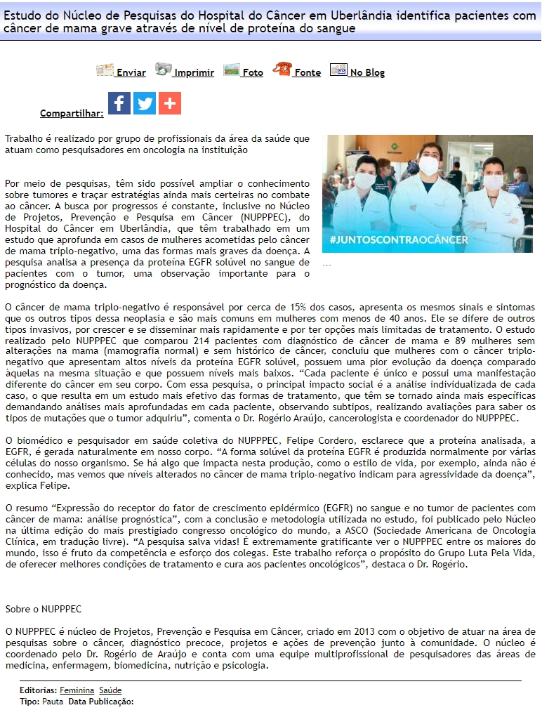 ONLINE-Estudo do Núcleo de Pesquisas do Hospital do Câncer em Uberlândia identifica pacientes com câncer de mama-14.07
