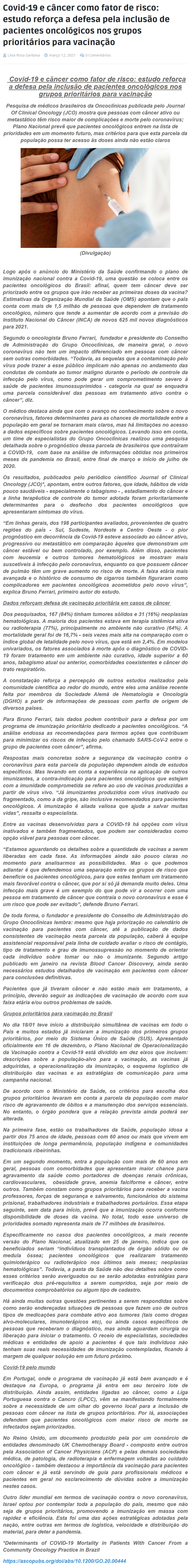 ONLINE - estudo reforça a defesa pela inclusão de pacientes oncológicos nos grupos prioritários para vacinação - 12.03