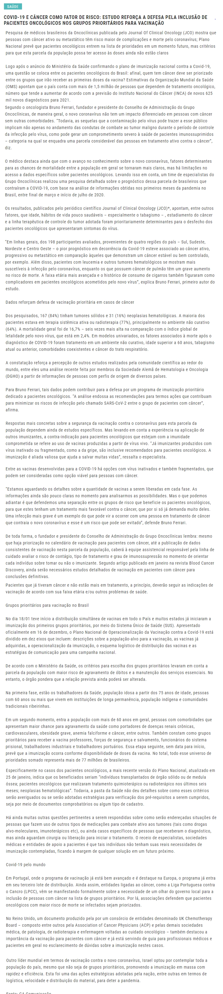 ONLINE -Estudo reforça a defesa pela inclusão de pacientes oncológicos nos grupos prioritários para vacinação - 15.02