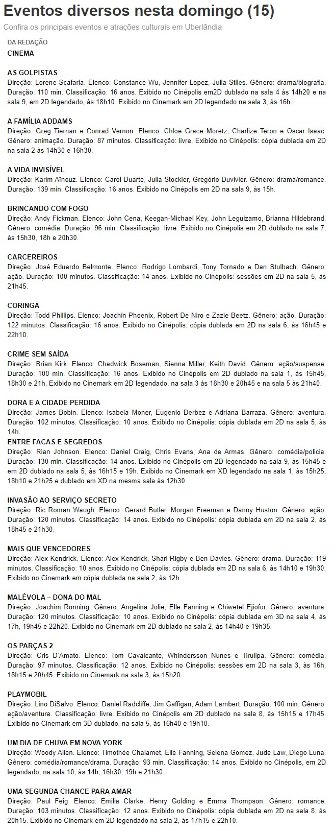 ONLINE - Eventos diversos nesta domingo (15) - CINEMA (15/12)