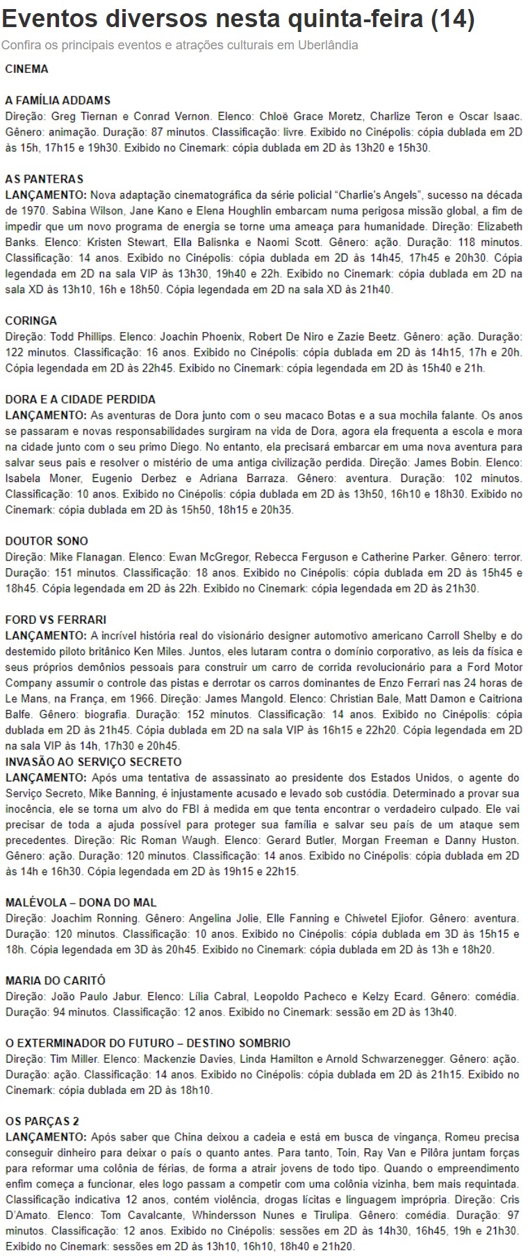 ONLINE - Eventos diversos nesta quinta-feira (14) - CINEMA (14/11)