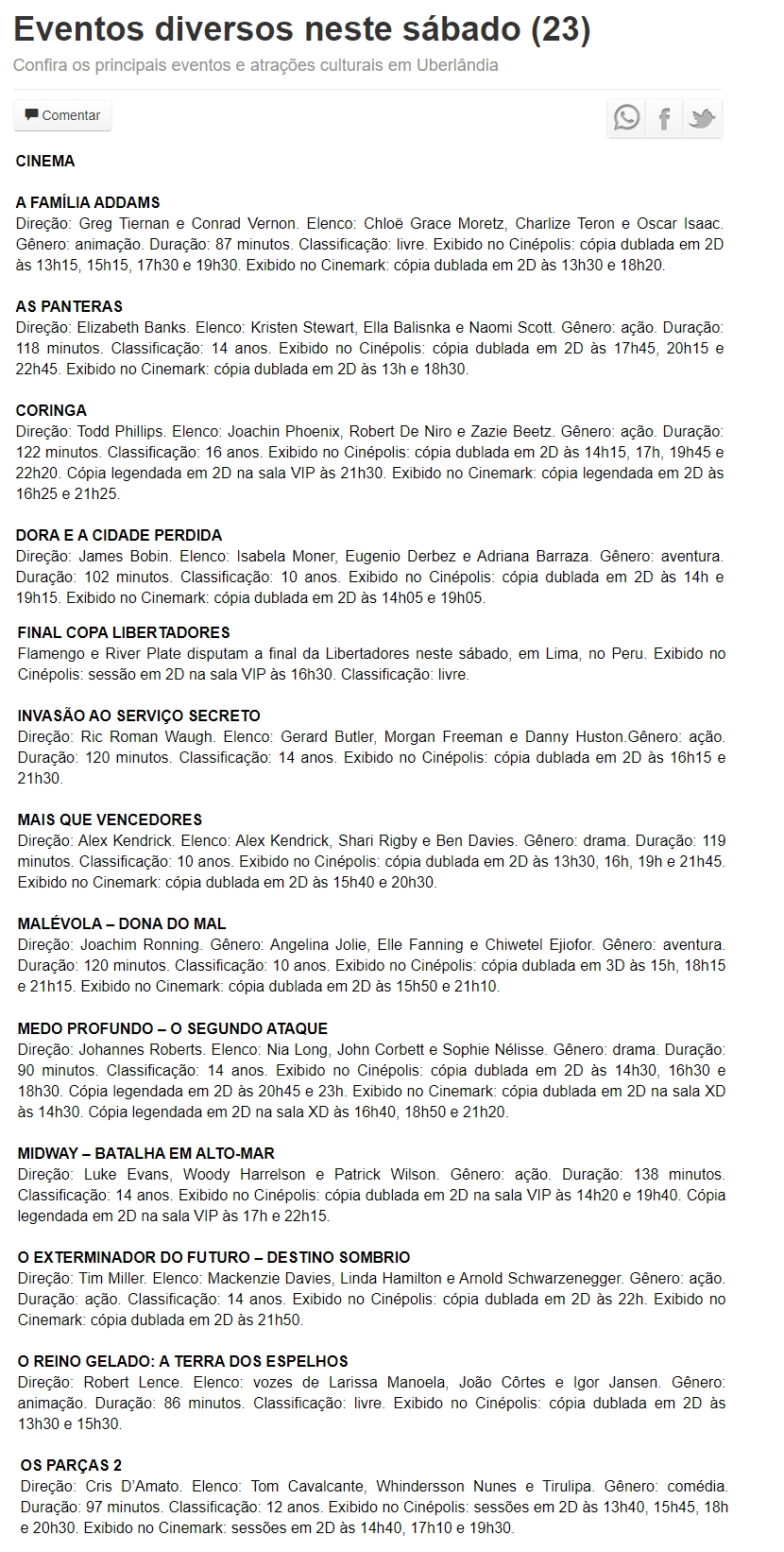ONLINE - Eventos diversos nesta quinta-feira (22) - CINEMA (22/11)