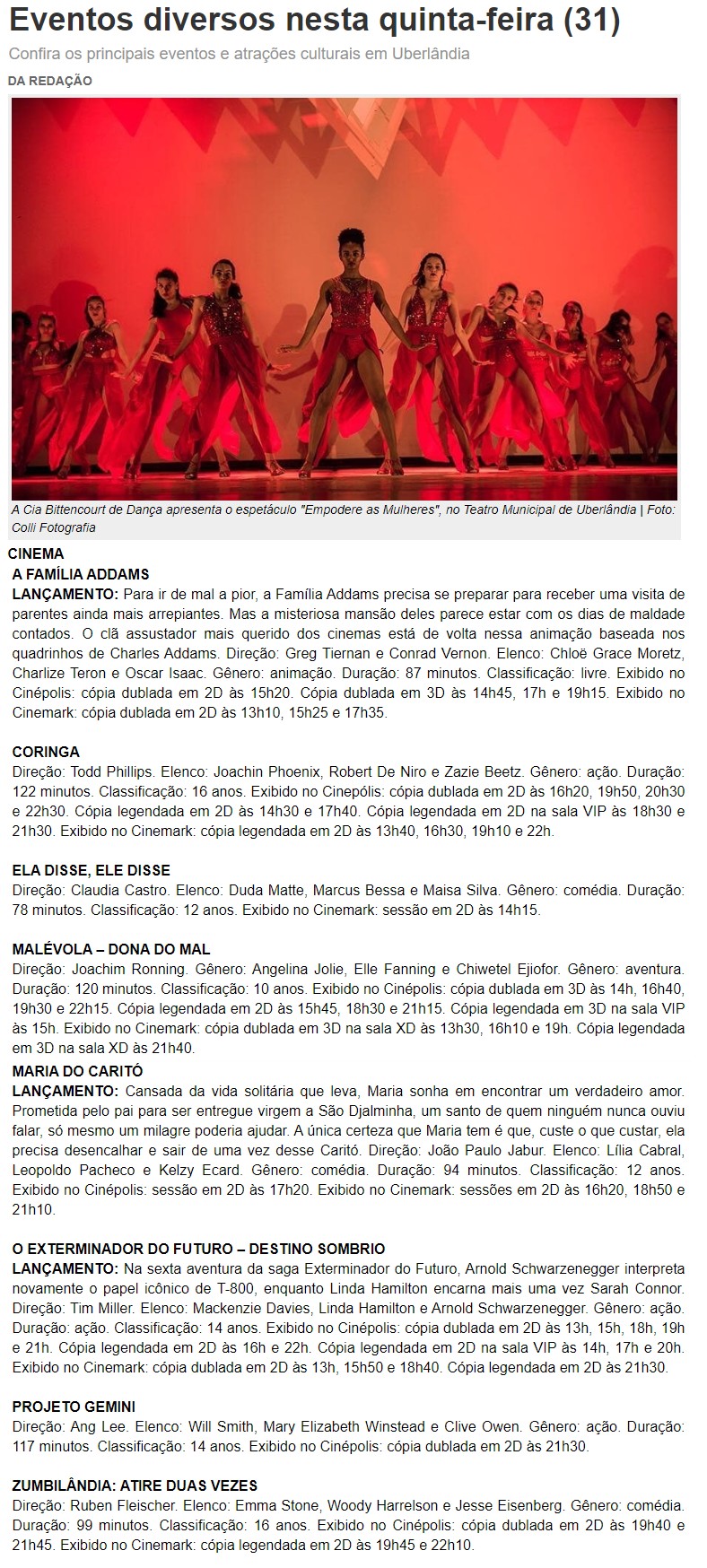 ONLINE - Eventos diversos nesta quinta-feira (31) - CINEMA (31/10)