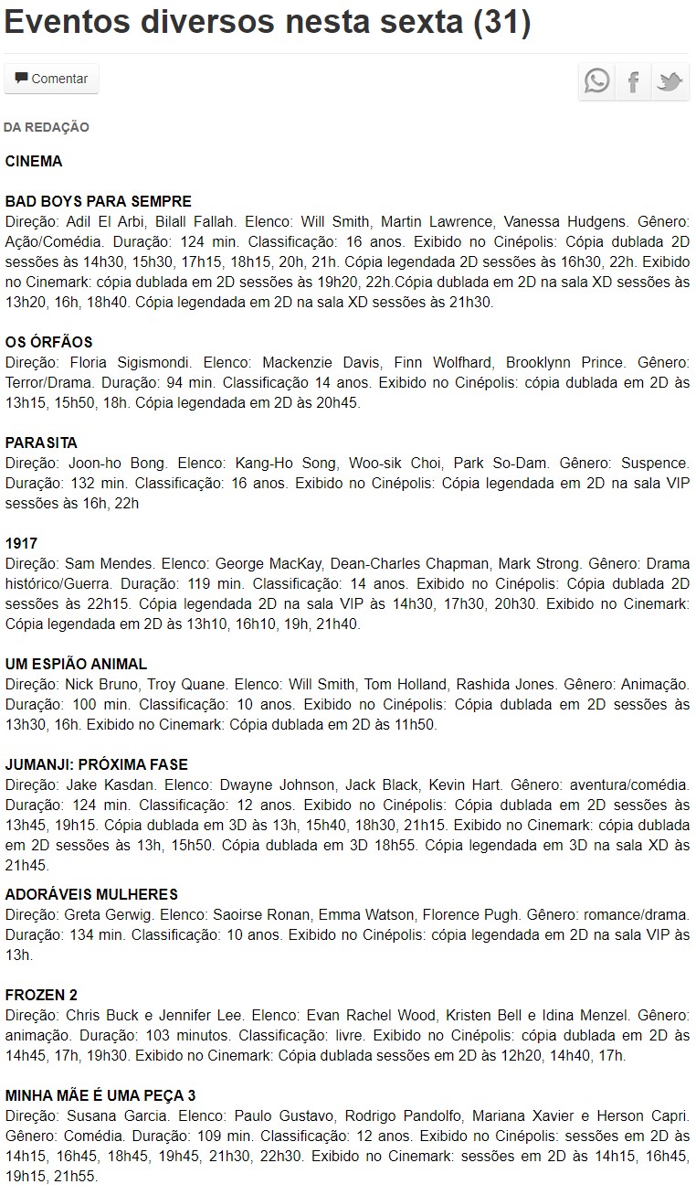 ONLINE - Eventos diversos nesta sexta (31) - CINEMA - 31/01