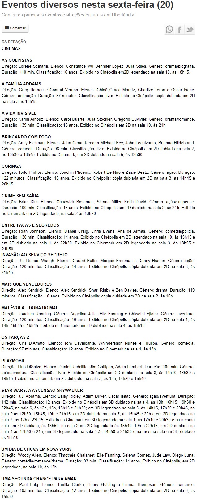 ONLINE - Eventos diversos nesta sexta-feira (20) - CINEMA (20/12)
