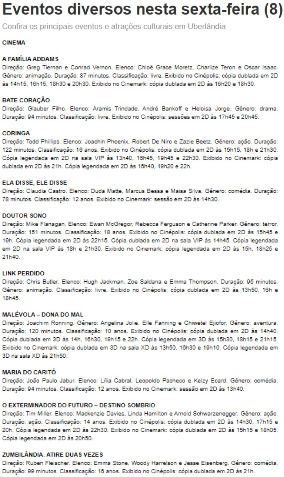 ONLINE - Eventos diversos nesta sexta-feira (8) - CINEMA (08/11)