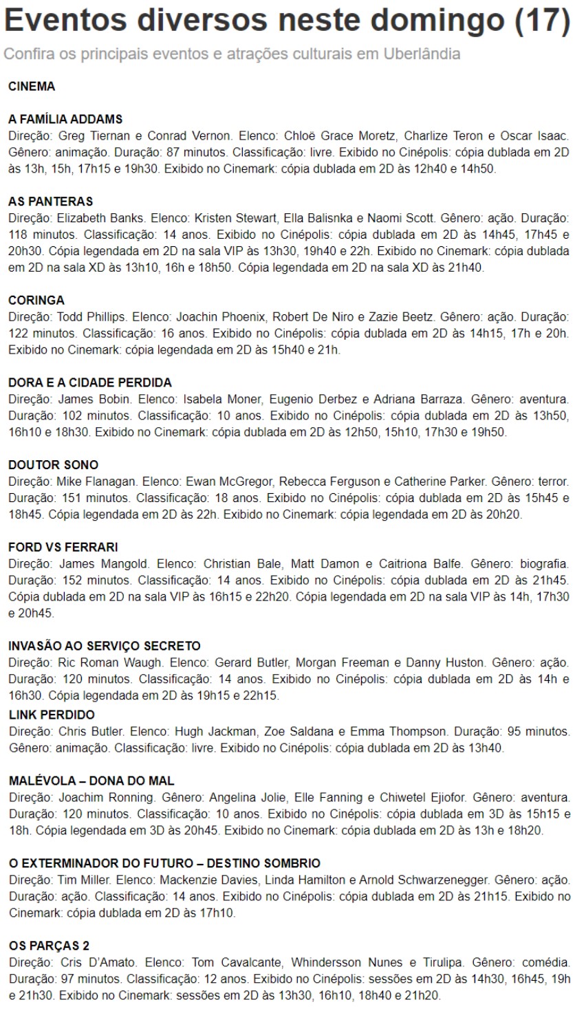 ONLINE - Eventos diversos neste domingo (17) - CINEMA (17/11)