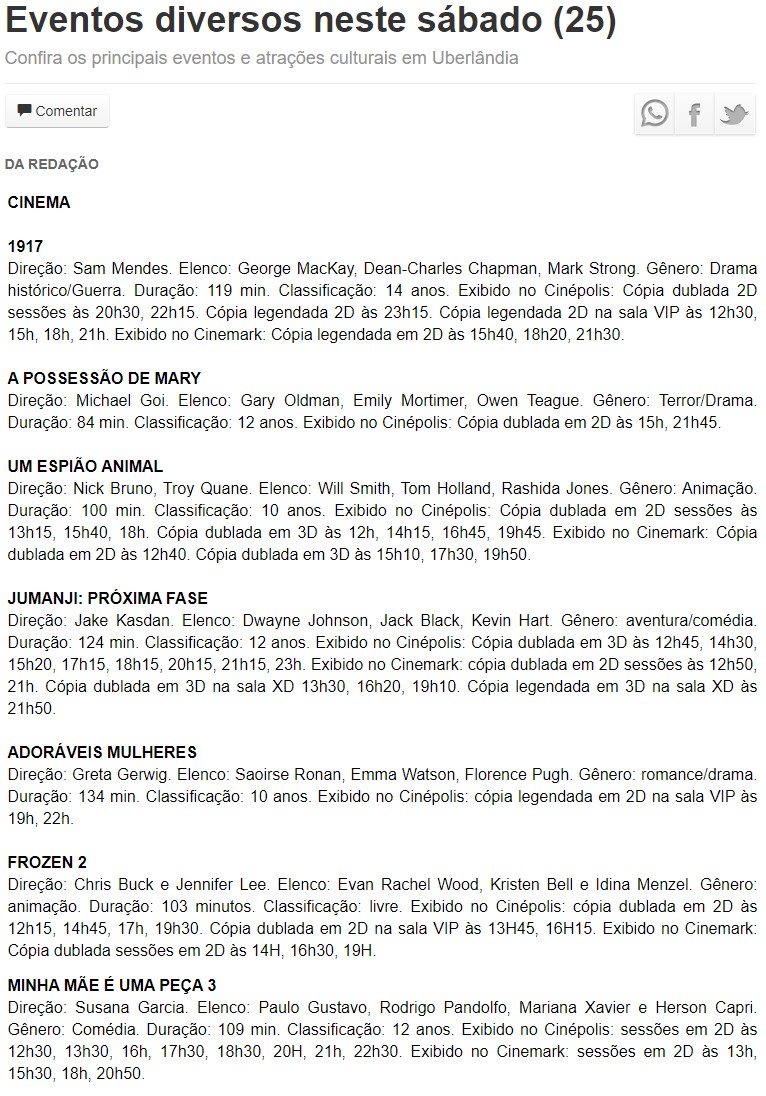 ONLINE - Eventos diversos neste sábado (25) - CINEMA - 25/01