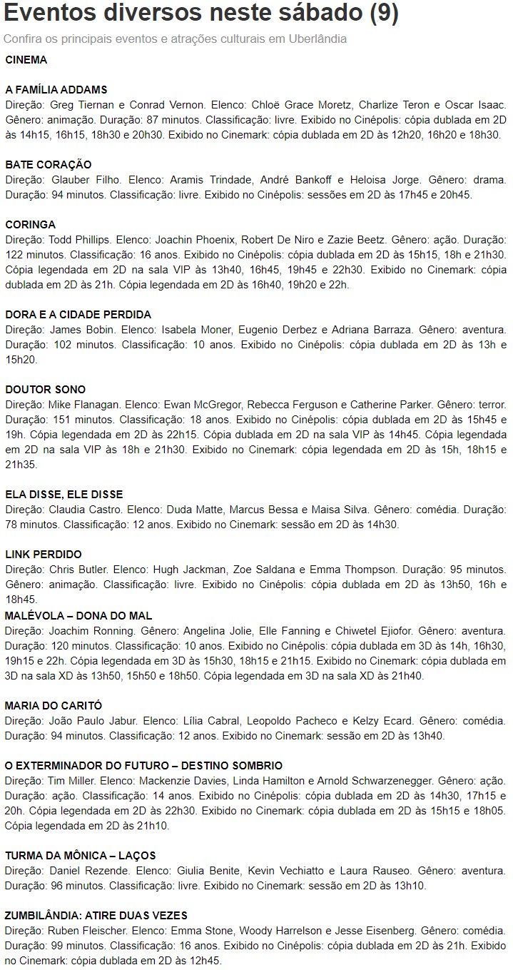 ONLINE - Eventos diversos neste sábado (9) - CINEMA (09/11)