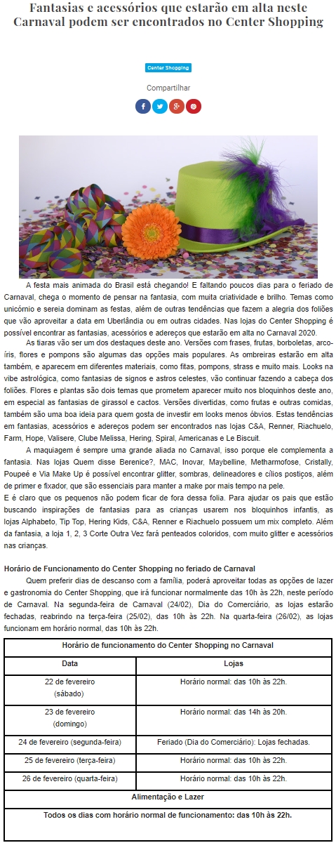 ONLINE - Fantasias e acessórios que estarão em alta neste Carnaval podem ser encontrados no Center Shopping - 17/02