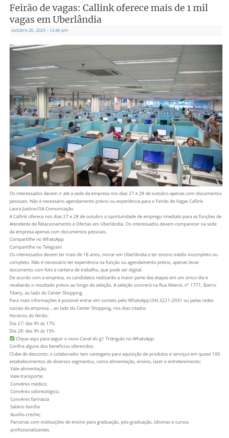 ONLINE - Feirão de vagas: Callink oferece mais de 1 mil vagas em Uberlândia - 26.10