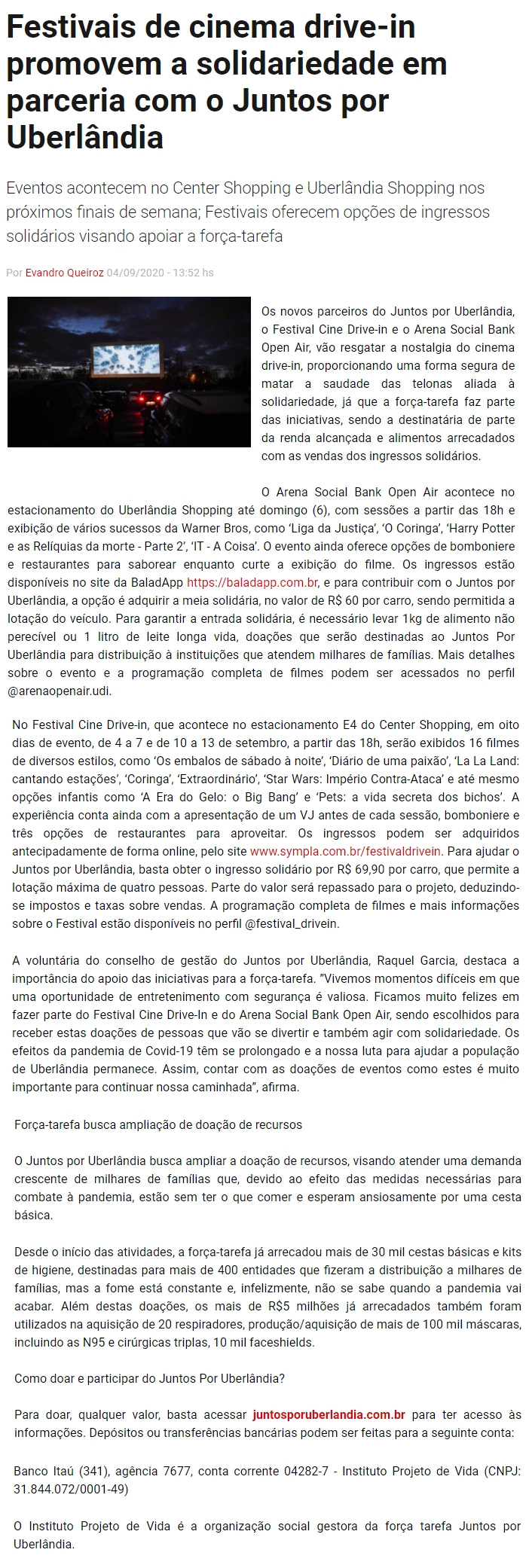 ONLINE - Festivais de cinema drive-in promovem a solidariedade em parceria com o Juntos por Uberlândia - Patrocínio Social Bank aos eventos - 04/09