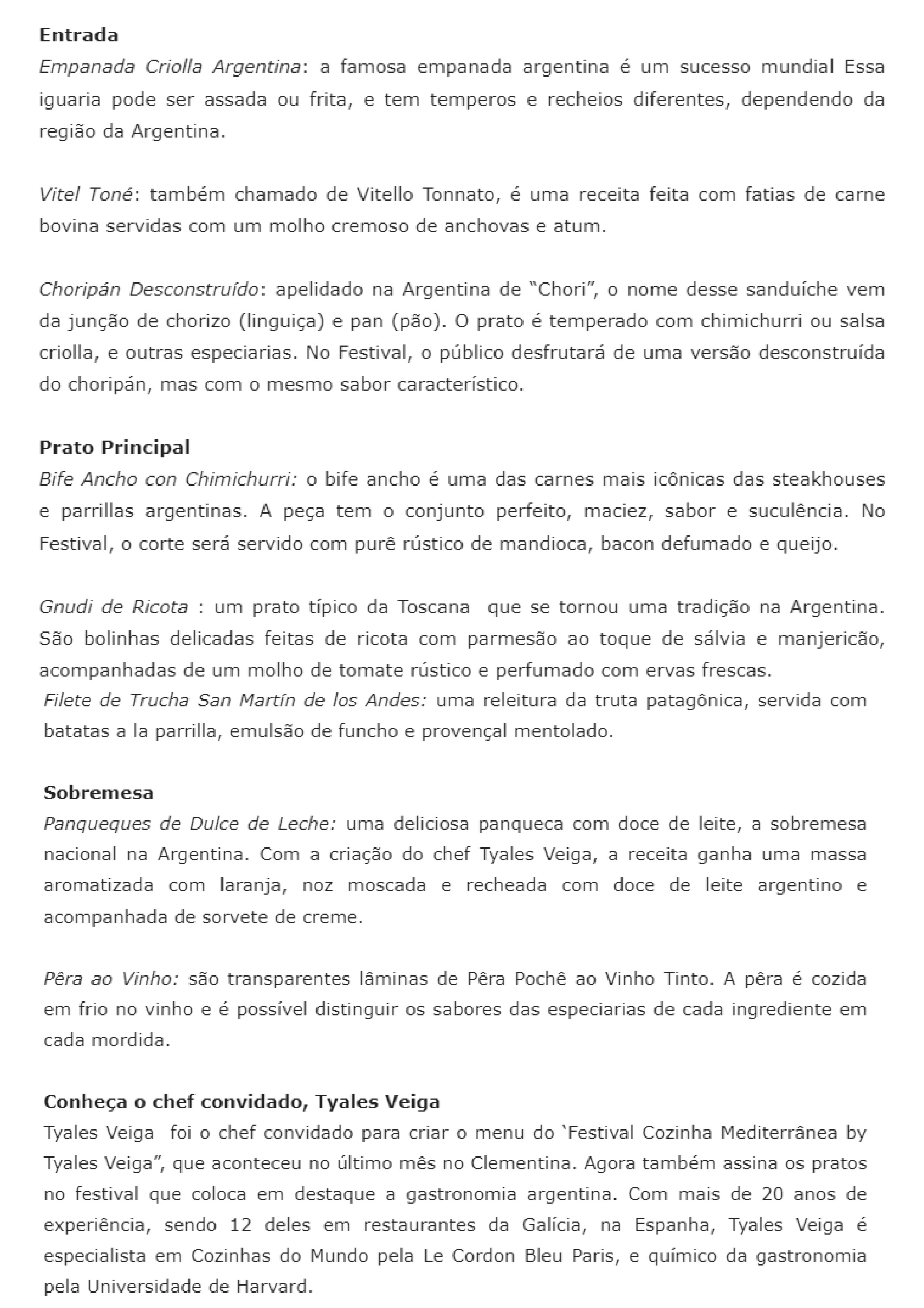 ONLINE - 'Festival Cozinha Argentina by Chef Tyales Veiga' do Clementina Bar e Ristoranti acontece entre os dias 21 de setembro e 05 de outubro -16.09