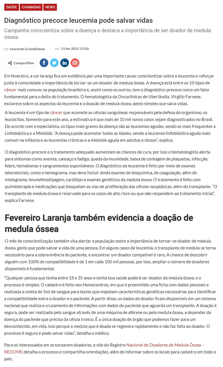 ONLINE-Fevereiro Laranja: diagnóstico precoce faz a diferença no tratamento da leucemia-21.02