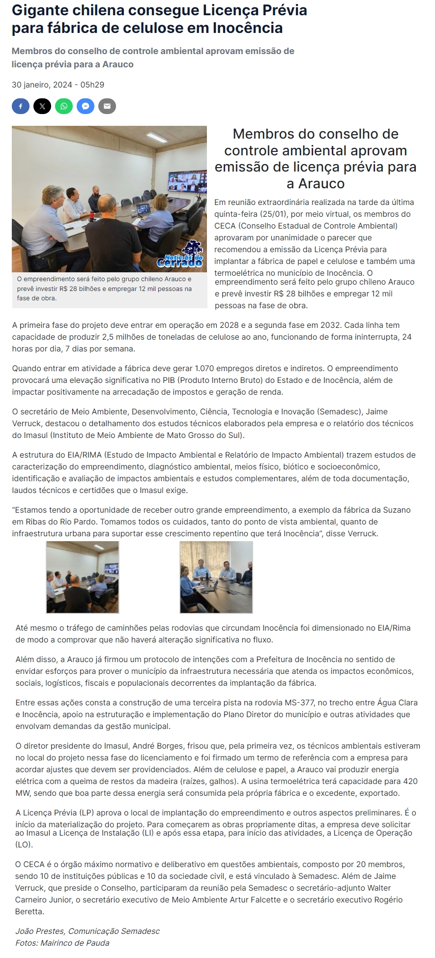 ONLINE - Gigante chilena consegue Licença Prévia para fábrica de celulose em Inocência - 30.01