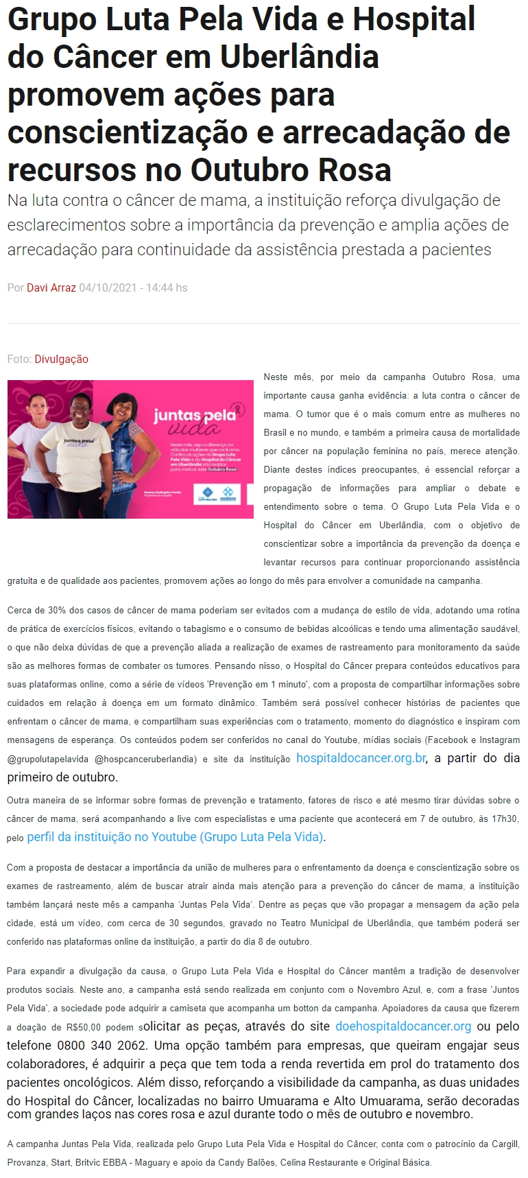 ONLINE-Grupo Luta Pela Vida e Hospital do Câncer em Uberlândia promovem ações para conscientização e arrecadação de recursos no Outubro Rosa - 04.10