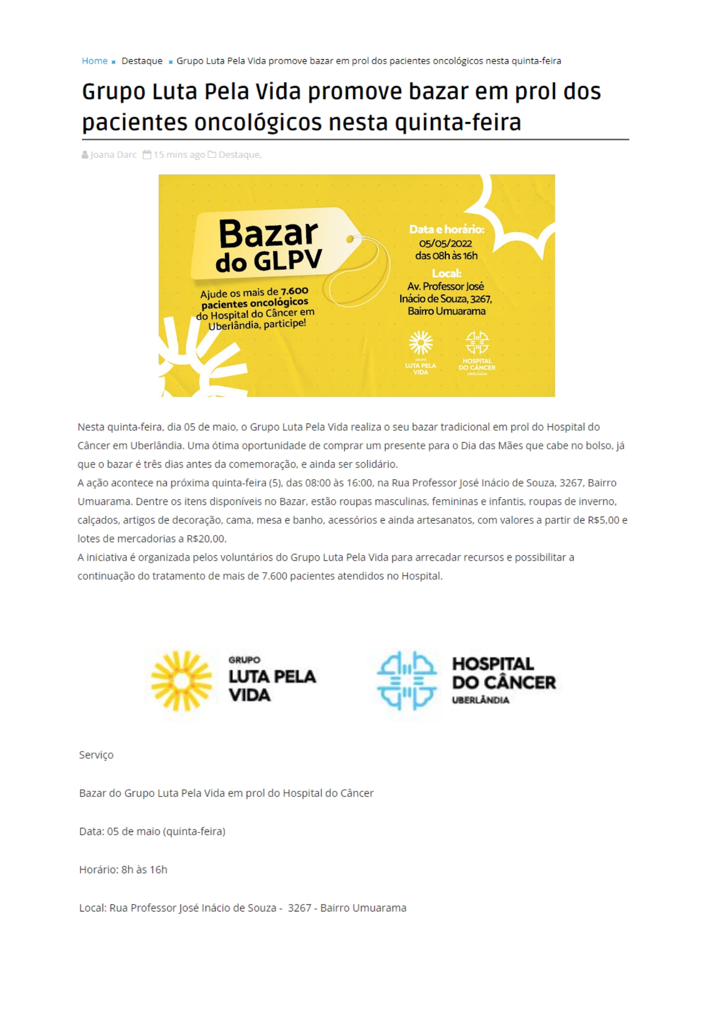 ONLINE - Grupo Luta Pela Vida promove bazar em prol dos pacientes oncológicos nesta quinta-feira -04.05