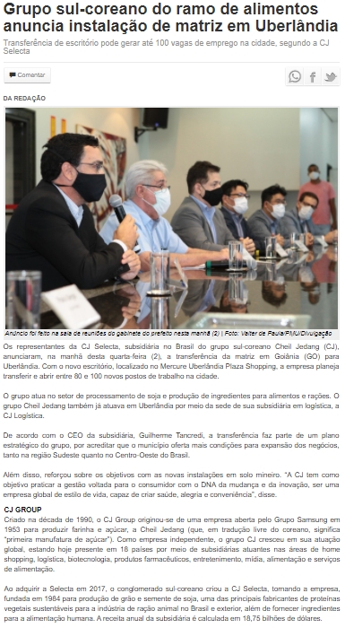 ONLINE - Grupo sul-coreano do ramo de alimentos anuncia instalação de matriz em Uberlândia - 02/09
