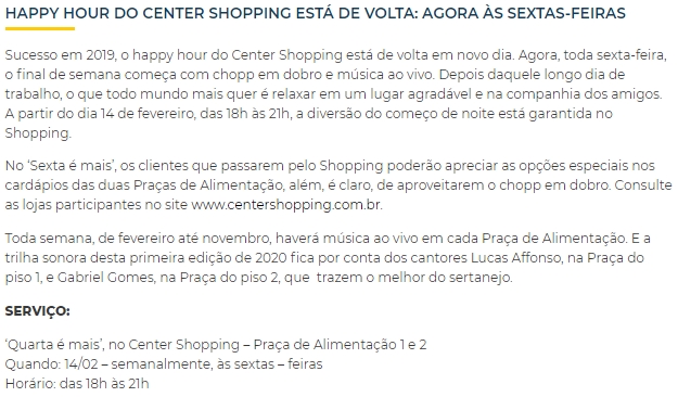 ONLINE - Happy Hour do Center Shopping está de volta: agora às sextas-feiras - 14/02