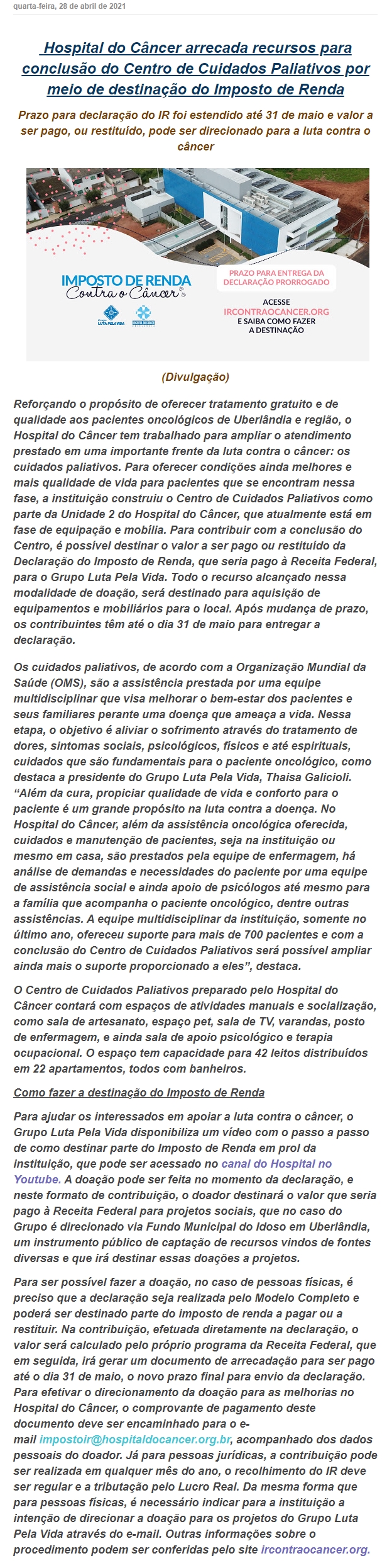ONLINE - Hospital do Câncer arrecada recursos para conclusão do Centro de Cuidados Paliativos por meio de destinação do Imposto de Renda - 28.04