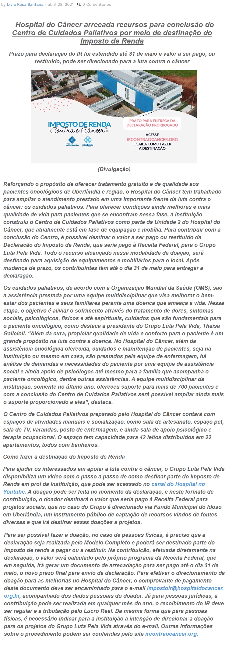 ONLINE - Hospital do Câncer arrecada recursos para conclusão do Centro de Cuidados Paliativos por meio de destinação do Imposto de Renda - 28.04