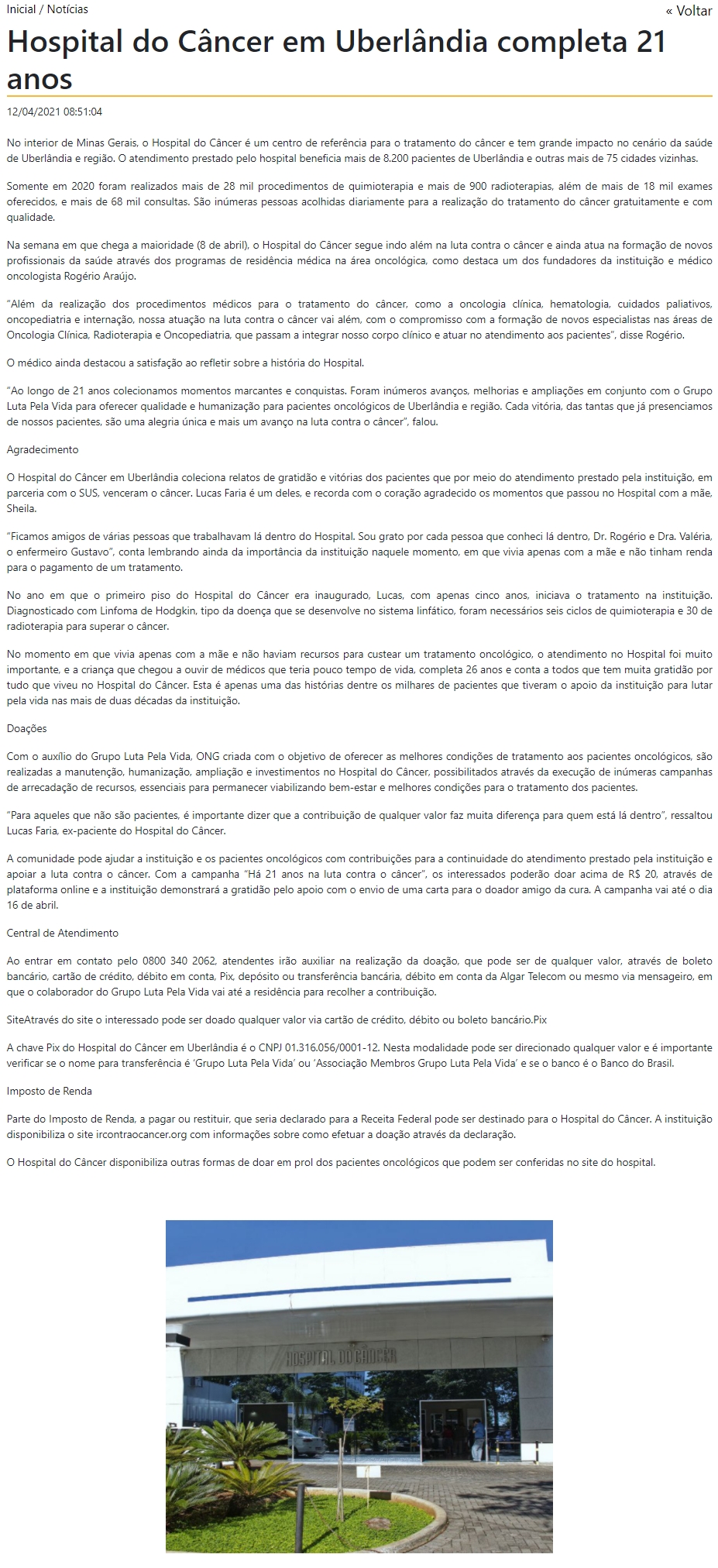 ONLINE - Hospital do Cāncer em Uberlāndia completa 21 anos - 12.04