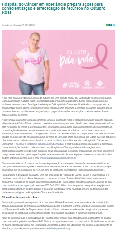 ONLINE - Hospital do Câncer em Uberlândia prepara ações para conscientização e arrecadação de recursos no Outubro Rosa - 02/10