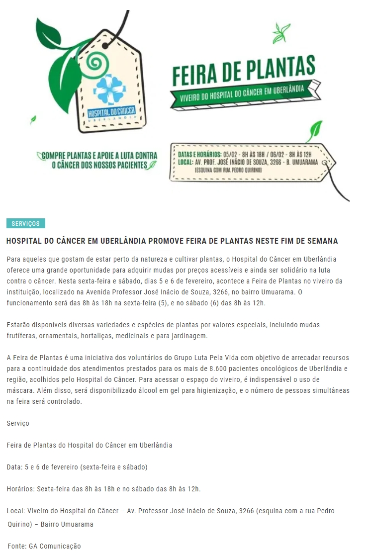 ONLINE - Hospital do Câncer em Uberlândia promove feira de plantas neste fim de semana - 03.02