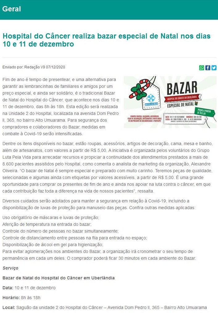 ONLINE - Hospital do Cāncer realiza bazar especial de Natal nos dias 10 e 11 de dezembro - 08/12