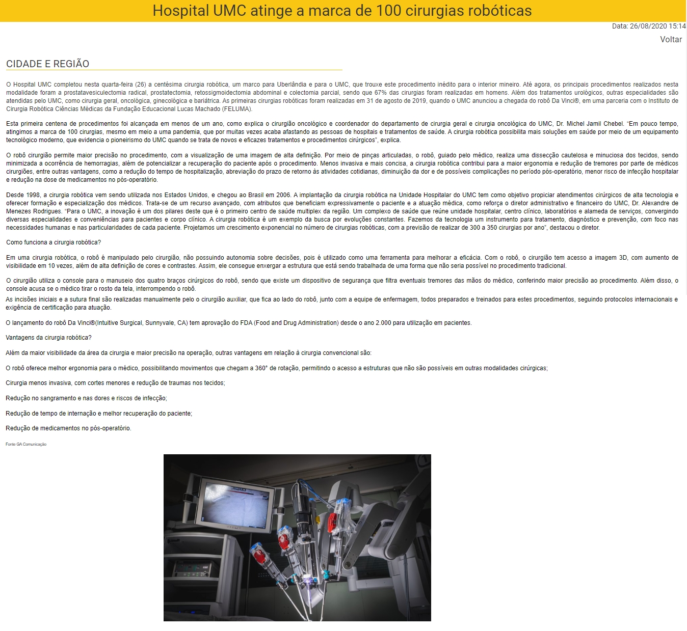 ONLINE - Hospital UMC atinge a marca de 100 cirurgias robóticas - 27/08