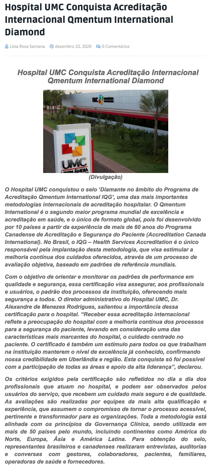 ONLINE - Hospital UMC conquista acreditação internacional Qmentum International Diamond - 22/12