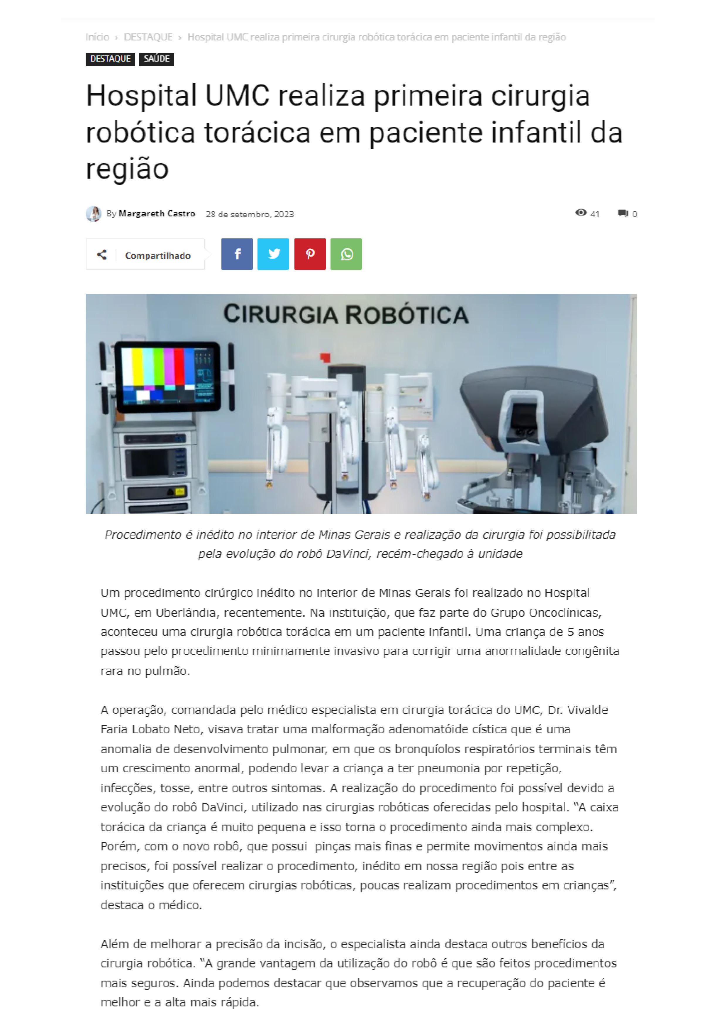 ONLINE - Hospital UMC realiza primeira cirurgia robótica torácica em paciente infantil da região - 28.09