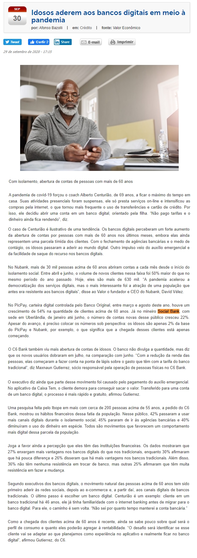 ONLINE - Idosos aderem aos bancos digitais em meio à pandemia - (29/09)