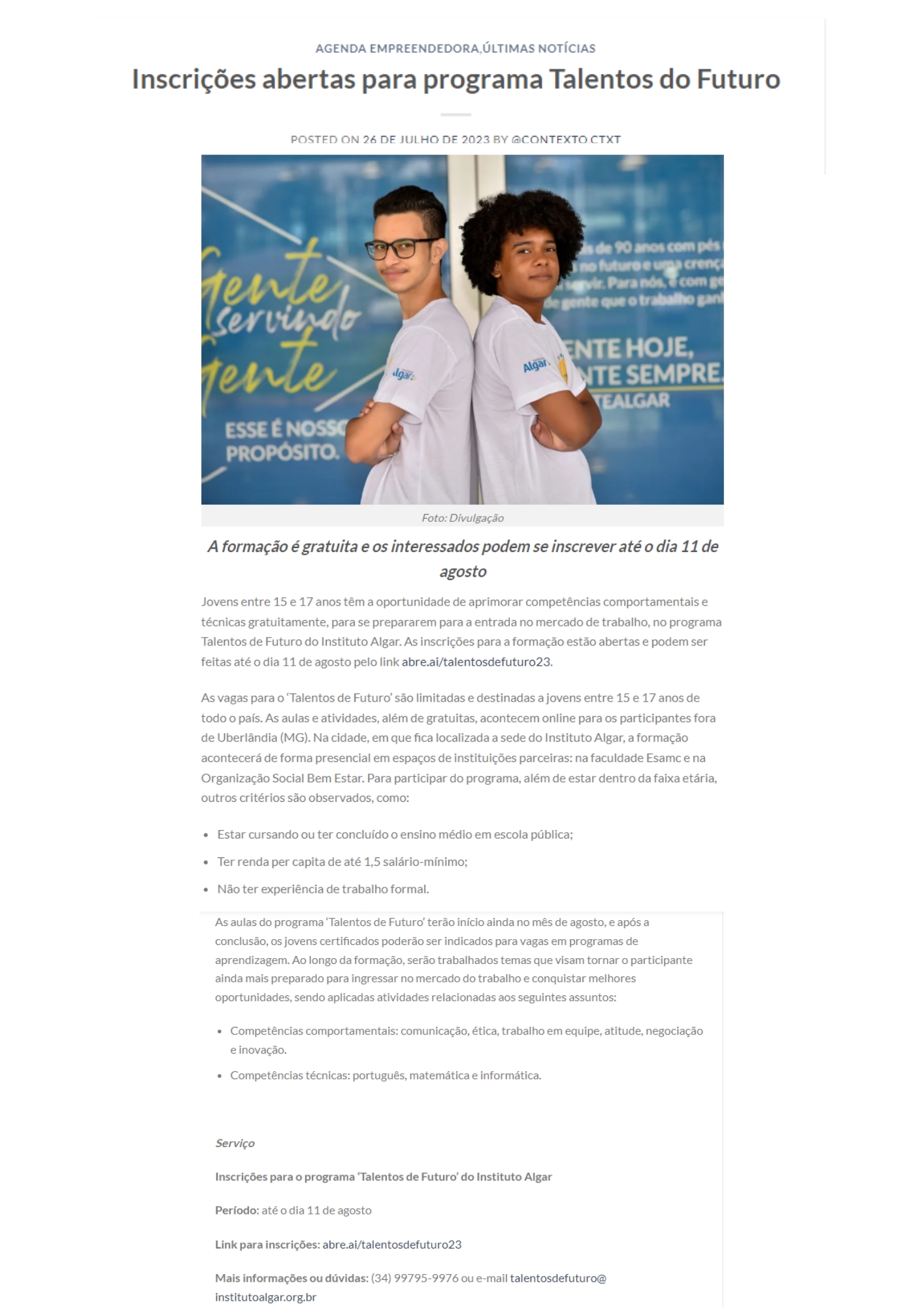 ONLINE - Inscrições abertas para programa do Instituto Algar que visa desenvolver competências comportamentais e técnicas em jovens - 25.07