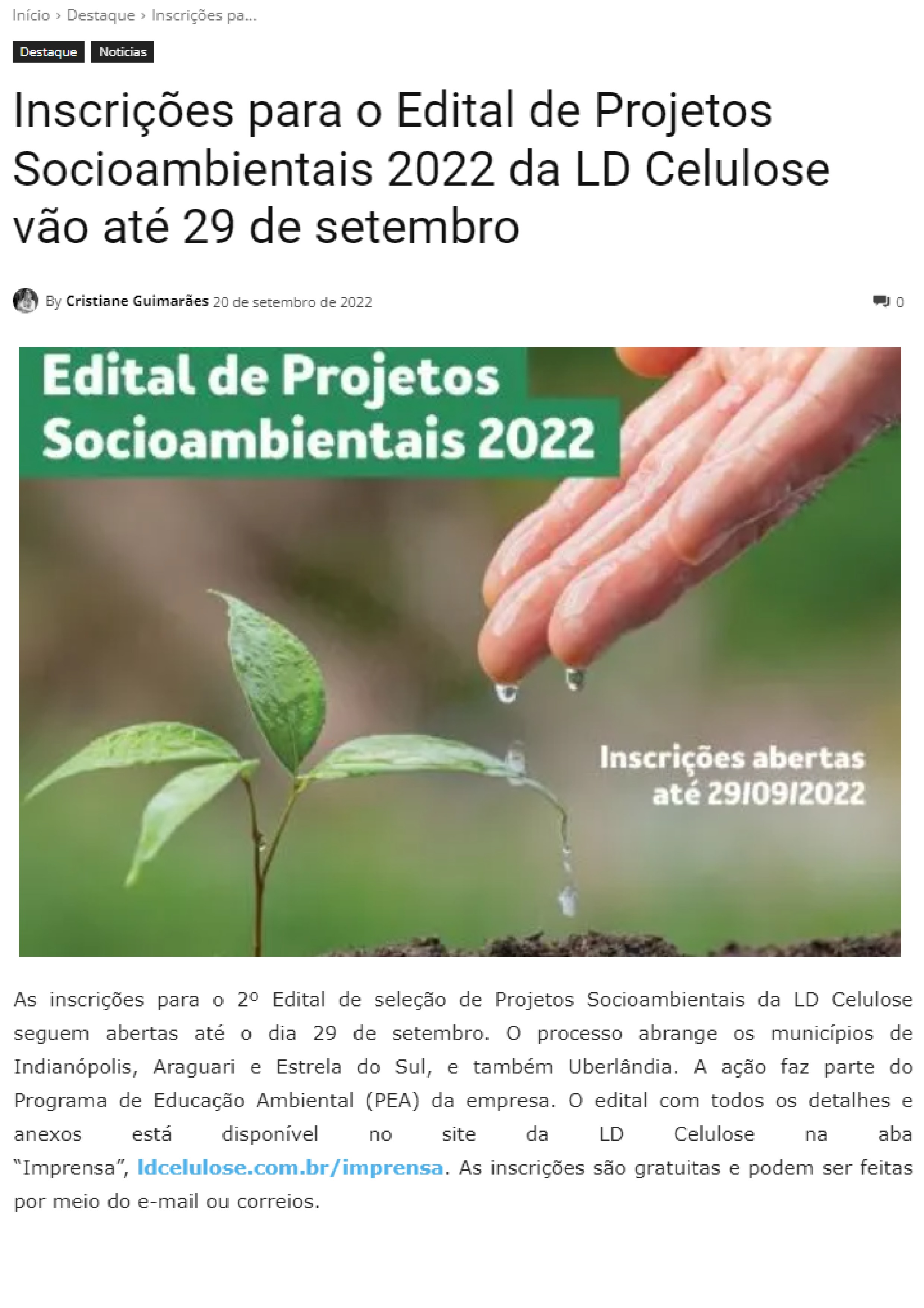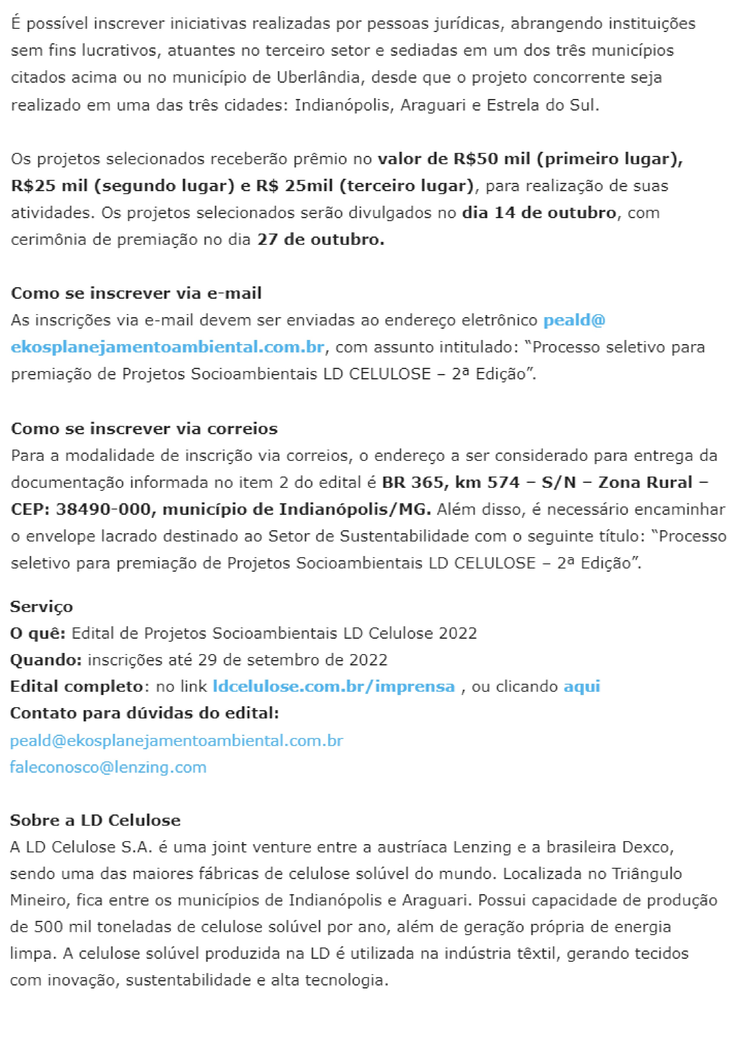 ONLINE - Inscrições para o Edital de Projetos Socioambientais 2022 da LD Celulose vão até 29 de setembro - 20.09