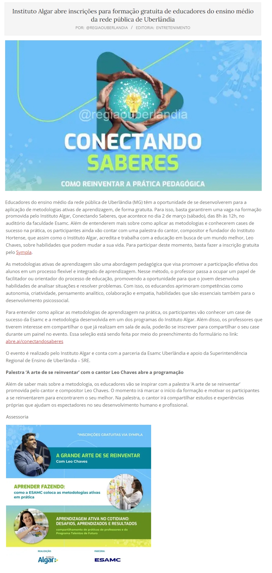ONLINE-Instituto Algar abre inscrições para formação gratuita de educadores do ensino médio da rede pública de Uberlândia-22.02