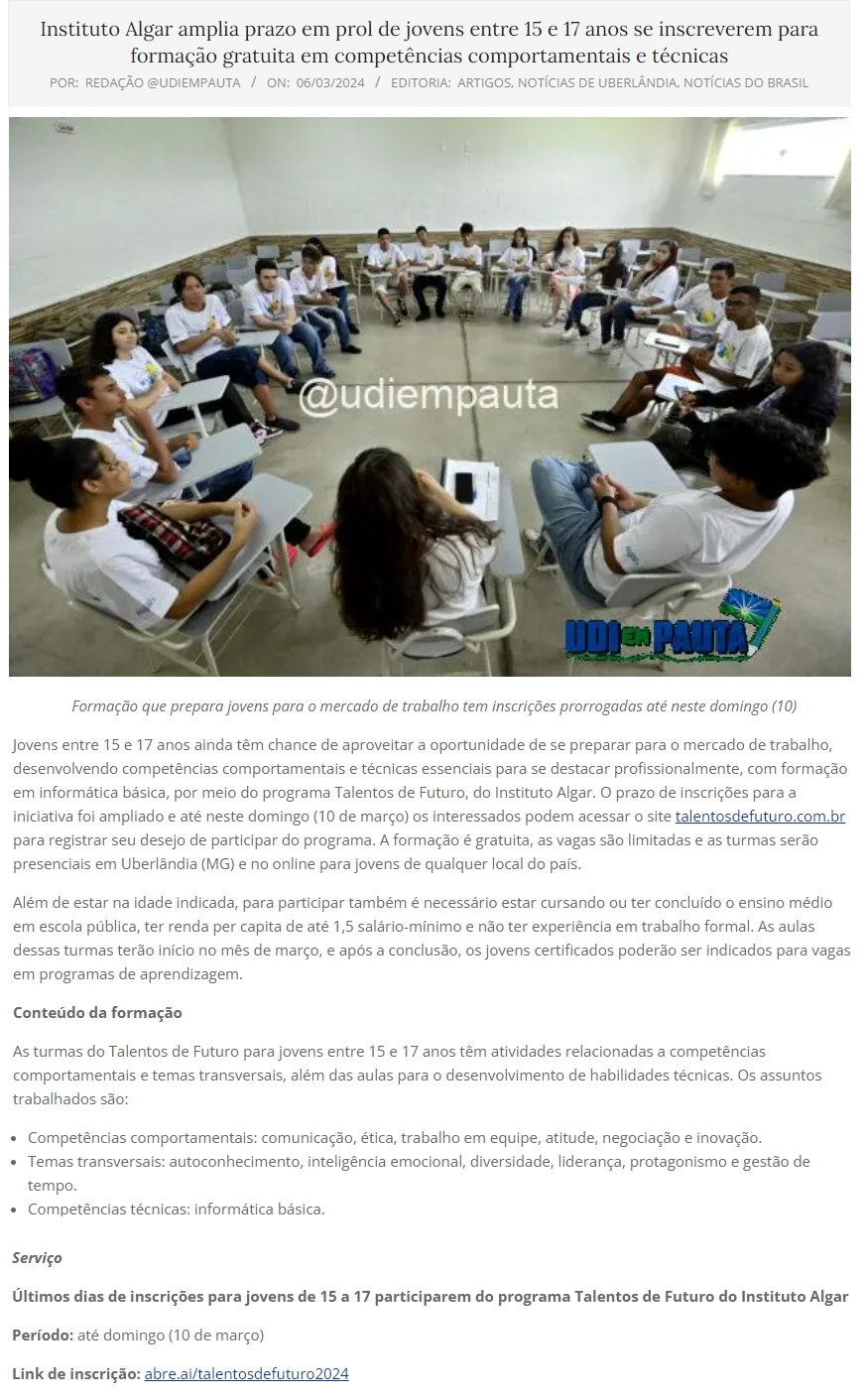 ONLINE - Instituto Algar amplia prazo em prol de jovens entre 15 e 17 anos se inscreverem para formação gratuita-06.03