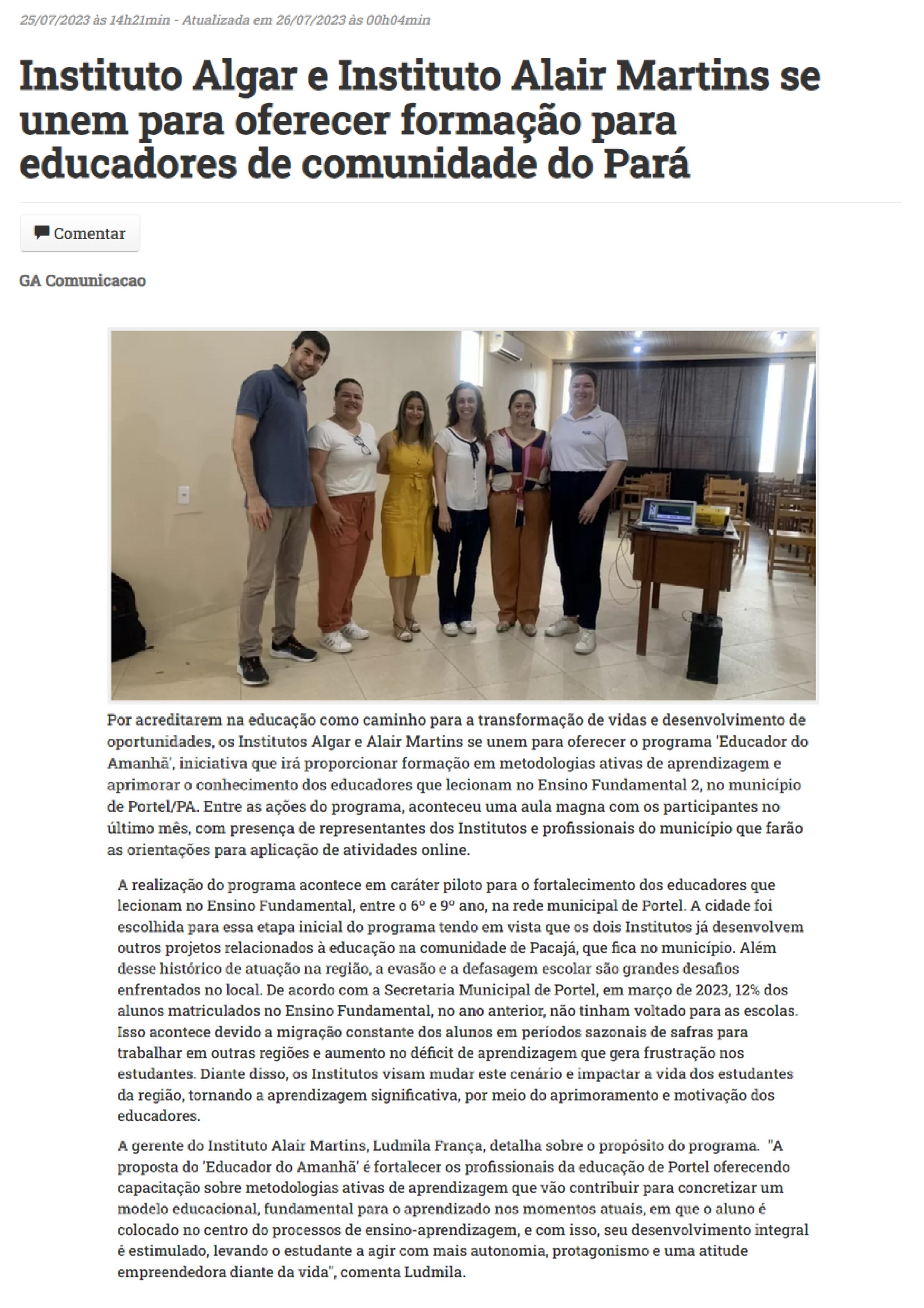 ONLINE - Instituto Algar e Instituto Alair Martins se unem para oferecer formação para educadores de comunidade do Pará - 25.07