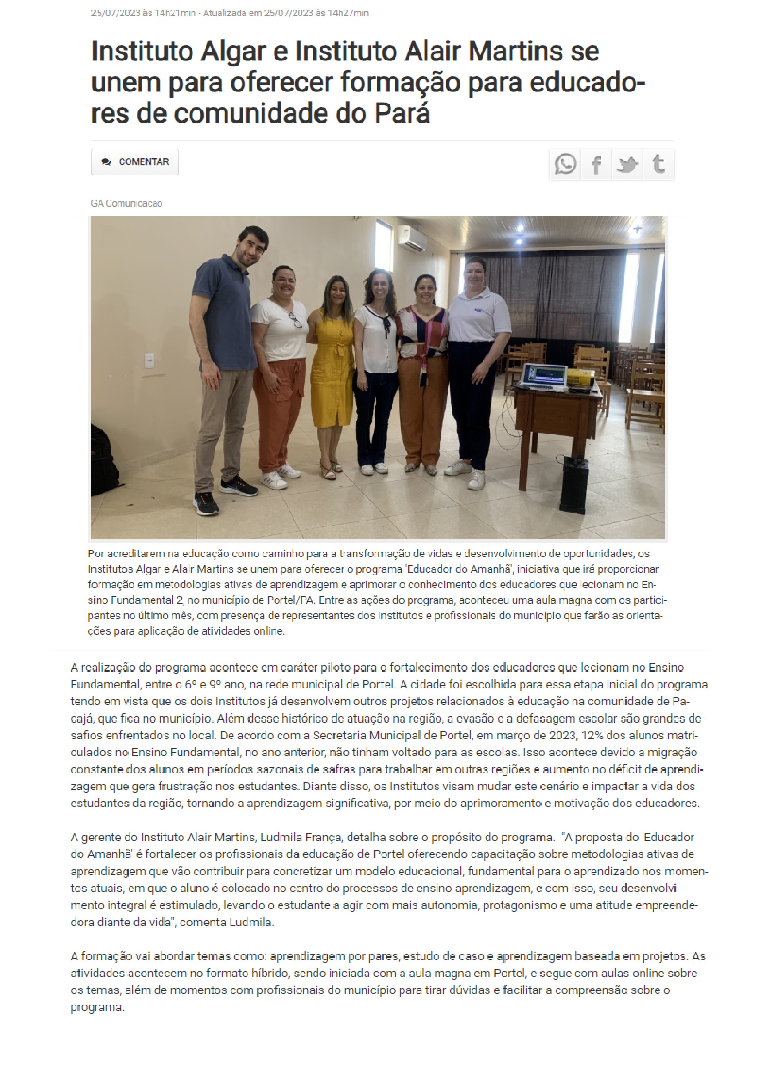 ONLINE - Instituto Algar e Instituto Alair Martins se unem para oferecer formação para educadores de comunidade do Pará - 25.07