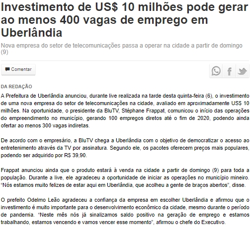https://diariodeuberlandia.com.br/noticia/26094/investimento-de-us-10-milhoes-pode-gerar-ao-menos-400-vagas-de-emprego-em-uberlandia