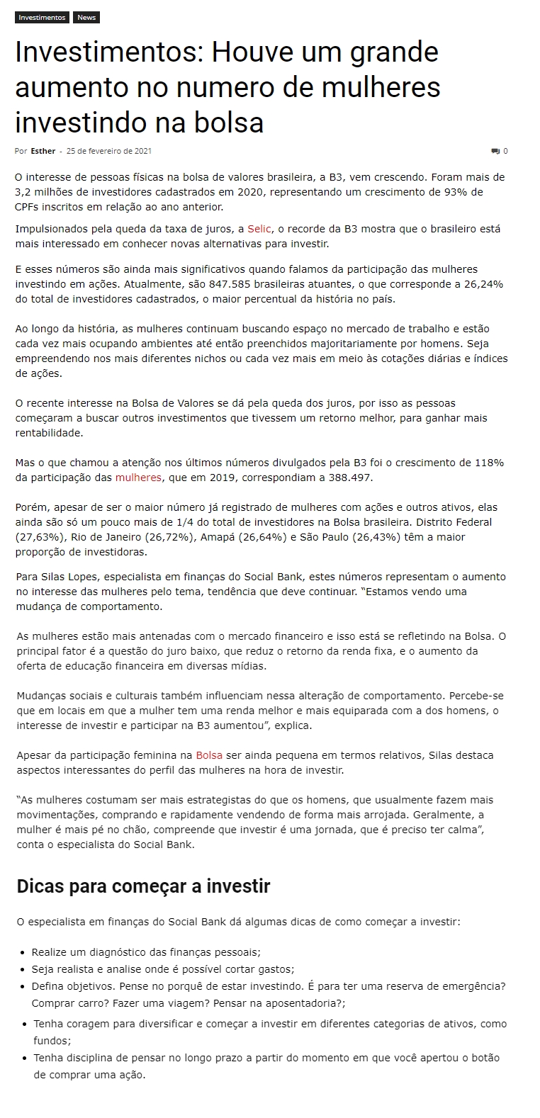 ONLINE - Investimentos: Houve um grande aumento no numero de mulheres investindo na bolsa - 25.02