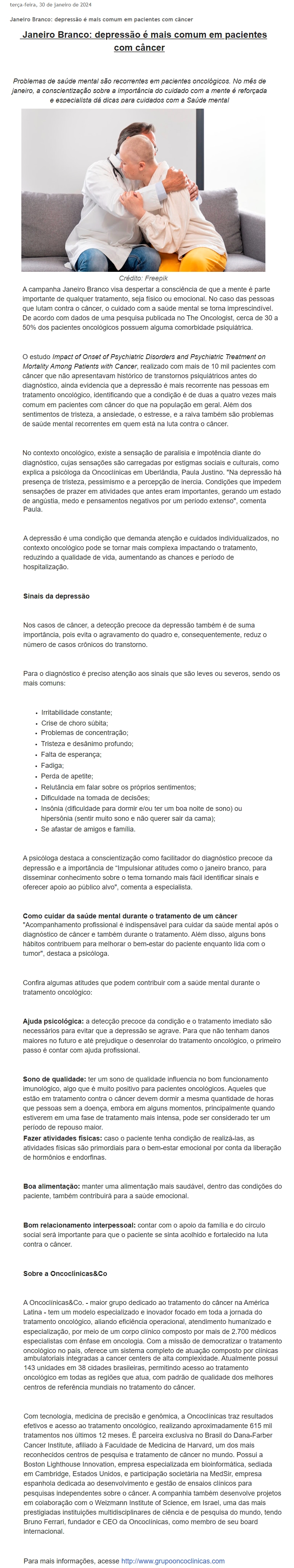 ONLINE-Janeiro Branco: depressão é mais comum em pacientes com câncer-30.01