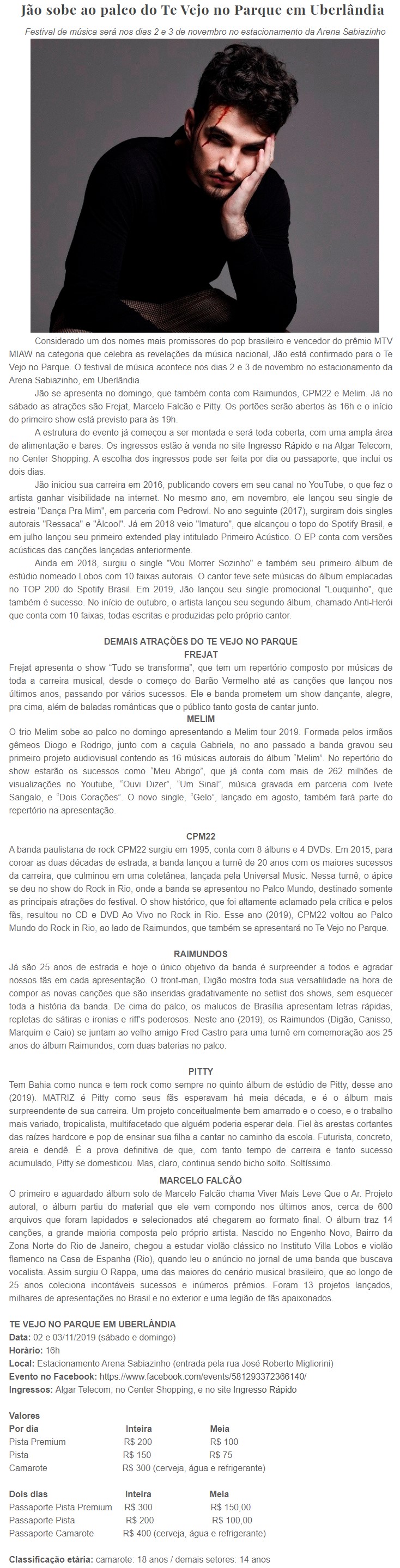 ONLINE - Jão sobe ao palco do Te Vejo no Parque em Uberlândia - PONTO DE VENDAS (25/10)