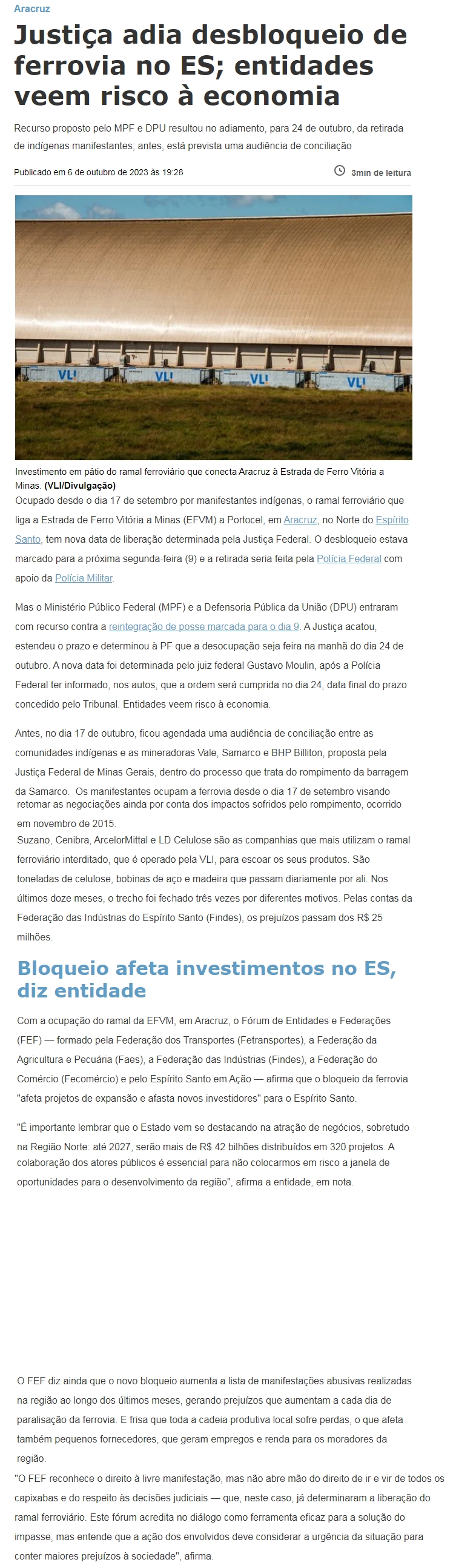 ONLINE - Justiça adia desbloqueio de ferrovia no ES; entidades veem risco à economia - 06.10