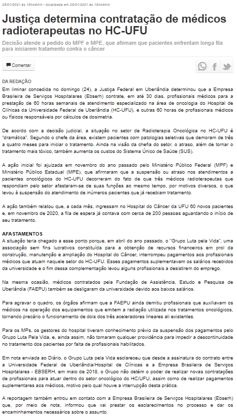 ONLINE - Justiça determina contratação de médicos radioterapeutas no HC-UFU - 26/01