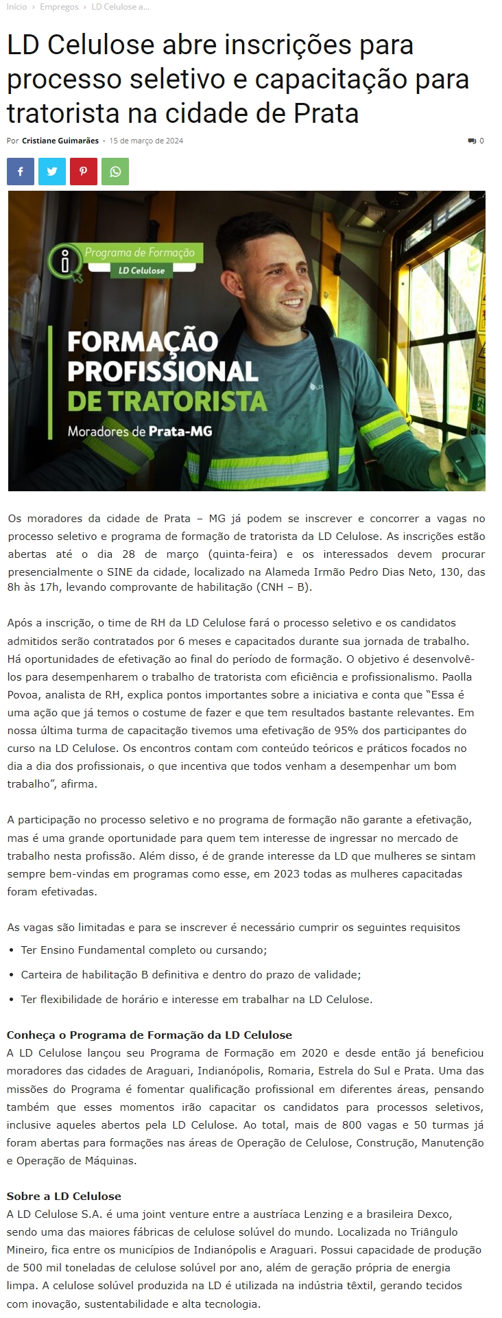 ONLINE - LD Celulose abre inscrições para processo seletivo e capacitação para tratorista na cidade de Prata - 15.03
