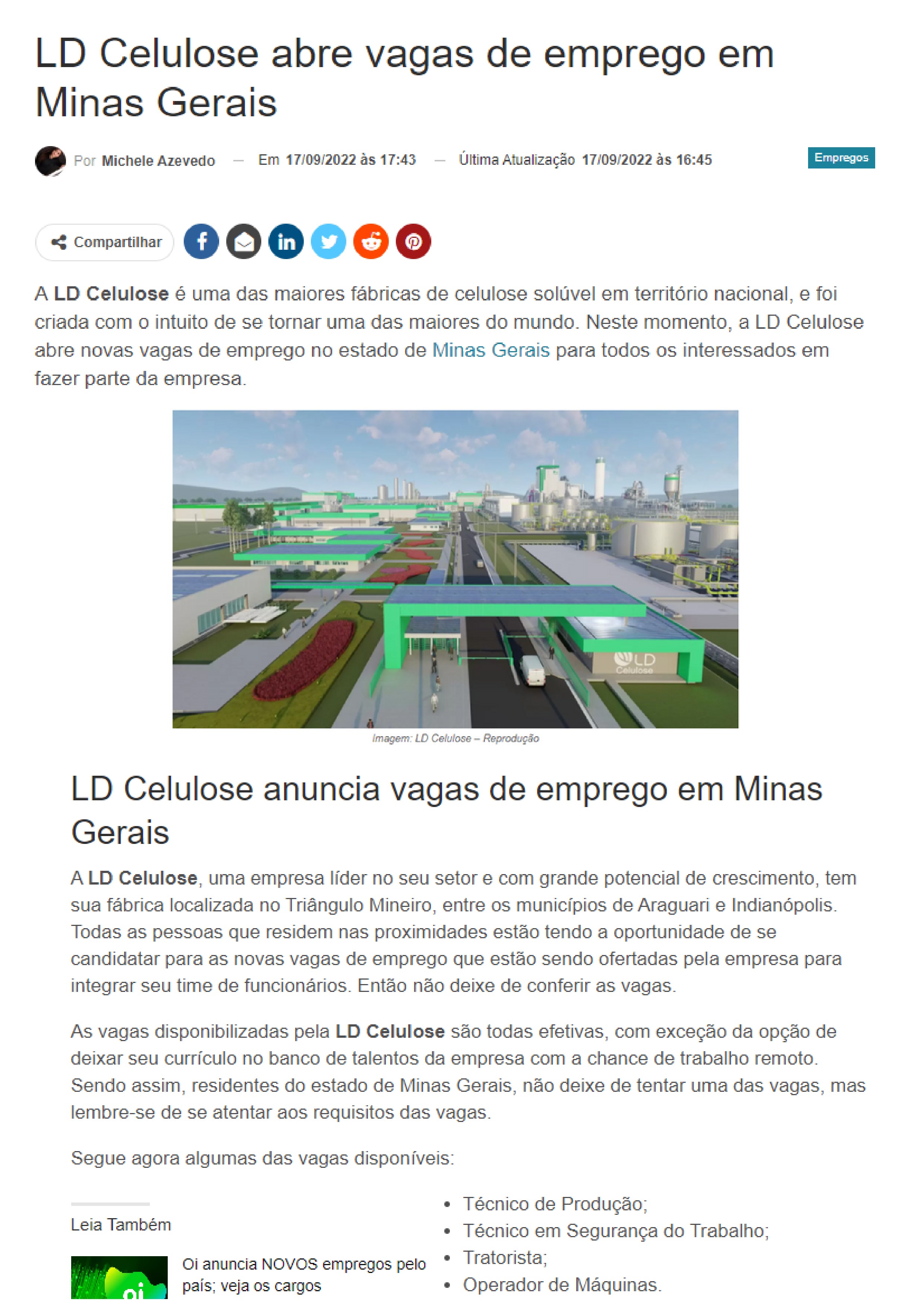 ONLINE - LD Celulose abre vagas de emprego em Minas Gerais - 17.09