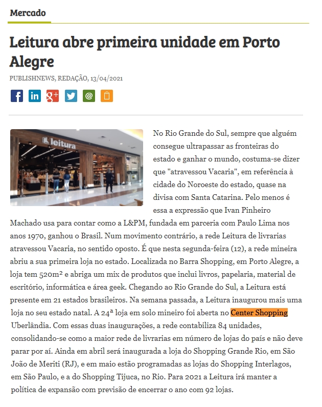 ONLINE - Leitura abre primeira unidade em Porto Alegre - Menção à abertura da loja no Center Shopping - 13.04