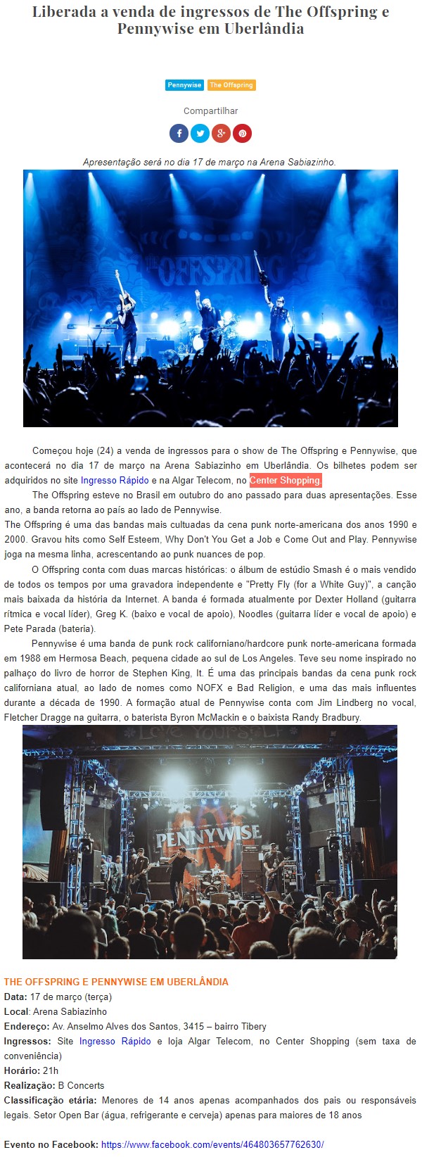 ONLINE - Liberada a venda de ingressos de The Offspring e Pennywise em Uberlândia - PONTO DE VENDAS - 31/01