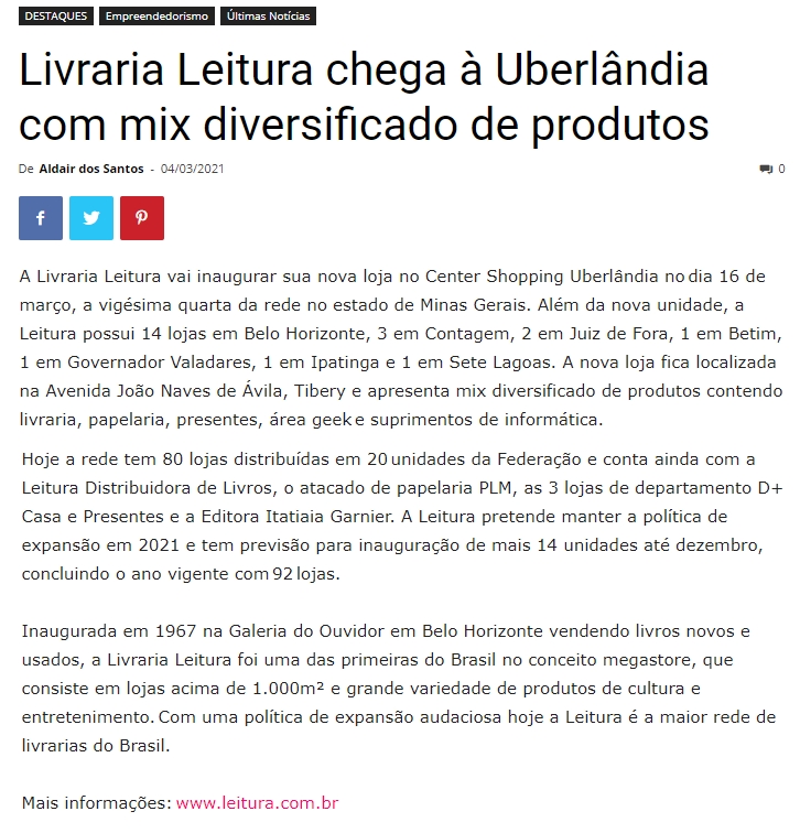 ONLINE - Livraria Leitura chega à Uberlândia com mix diversificado de produtos - 04.03
